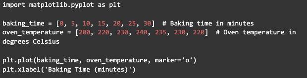 גרף קו - אידאלי להציג טרנדים לאורך זמן, למשל בדוגמא שלפנינו ניתן להשתמש בתרשים קו כדי להדגיש את פרופיל הטמפרטורה הנדרש כדי להשיג את הקראסט המושלם לפיצה. ציר ה-x מייצג את זמן האפייה, בעוד שציר ה-y מייצג את טמפרטורת התנור. התרשים הקווי מציג את השינויים בטמפרטורה במהלך תהליך האפייה, וזה יעזור לנו לזהות את ההגדרות האידיאליות לטמפרטורה עבור קראסט פריך וטעים.